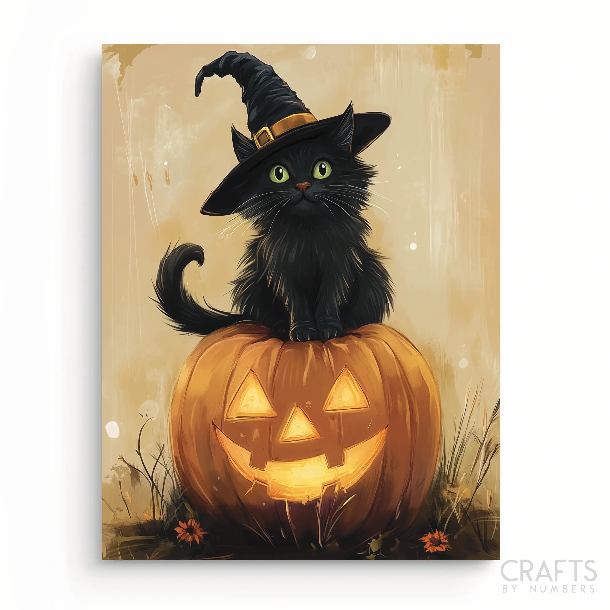 Add some Halloween magic to your décor with Hocus Pocus Kitty! This paint by numbers kit showcases a charming black cat in a witch's hat, sitting proudly on a glowing pumpkin. Perfect for cat lovers and Halloween enthusiasts, this kit brings a touch of spooky cuteness to any space!