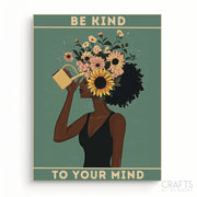 Embrace the art of mindfulness with the Be Kind to Your Mind paint-by-numbers kit. This beautifully crafted design features a serene woman with sunflowers and wildflowers blooming from her hair, symbolizing growth, self-love, and mental wellness. As you paint, you'll find yourself immersed in both a calming and empowering experience, with the soothing reminder to treat your mind with kindness.