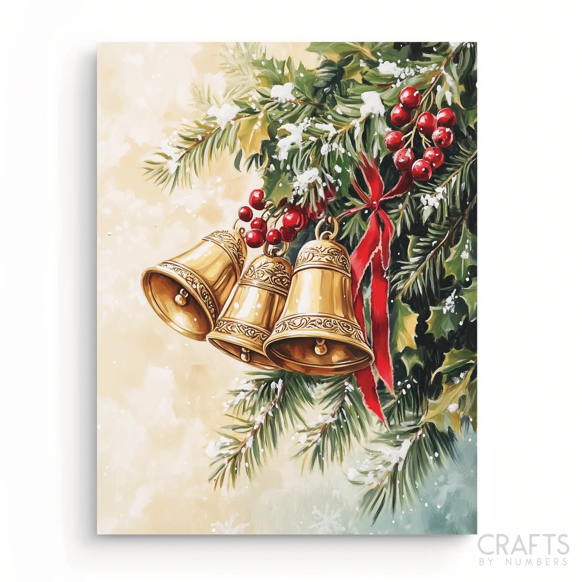 Ring in the holiday season with Golden Jingle Bells. This exquisite paint by numbers kit showcases a trio of ornate golden bells nestled among lush greenery, vibrant holly, and bright red berries, tied together with a festive red ribbon. The classic Christmas charm of this piece makes it a perfect addition to your seasonal decor or a thoughtful gift for loved ones. Capture the magic and warmth of the holidays, one brushstroke at a time, and let the beautiful tones of gold, green, and red fill your home with festive spirit.
