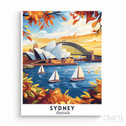 Celebrate the beauty of Australia with this Sydney - Travel Poster paint by numbers kit. Recreate the iconic Sydney Opera House, Harbor Bridge, and sailboats gliding across the vibrant harbor, framed by warm autumn tones. Perfect for artists of all skill levels, this kit lets you capture the charm and elegance of Sydney on your canvas.
