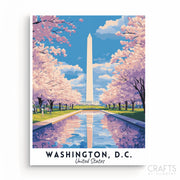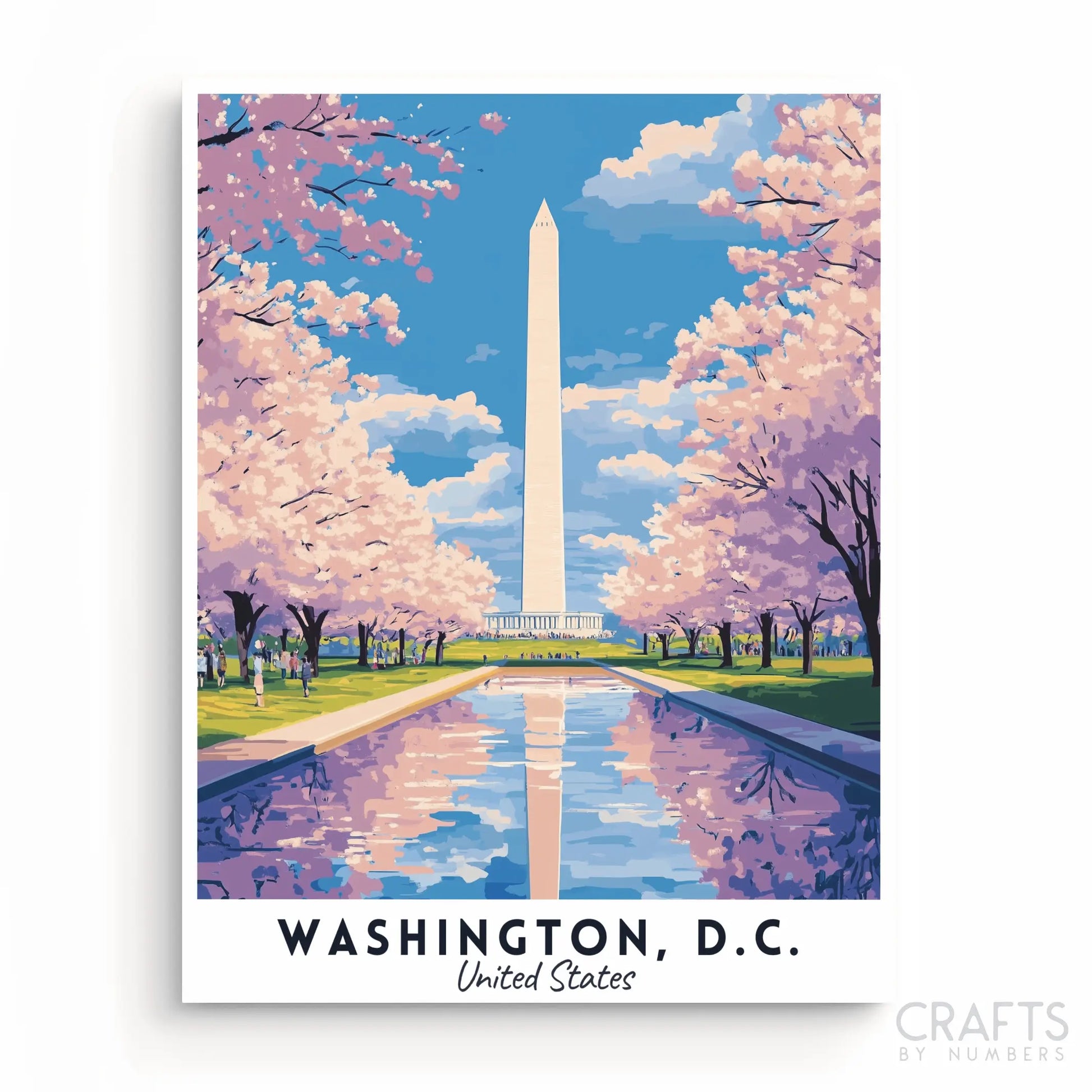 Celebrate the beauty of Washington, D.C., with this Washington, D.C. - Travel Poster paint by numbers kit. Recreate the iconic Washington Monument surrounded by blooming cherry blossoms and its serene reflection in the water. Perfect for artists of all levels, this kit lets you capture the elegance and grandeur of the United States capital in stunning detail.