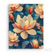 Magnolia Ember radiates warmth and elegance. This floral paint by numbers kit showcases creamy blossoms kissed with rich orange hues, set against lush, velvety greens — a striking balance of softness and fire.
