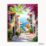 Escape to a sunlit paradise with Mediterranean Whispers, a breathtaking paint by numbers kit showcasing charming villas draped in vibrant flowers and a serene view of boats floating on crystal-clear waters. A dreamy project for anyone who loves coastal charm and colorful scenes!