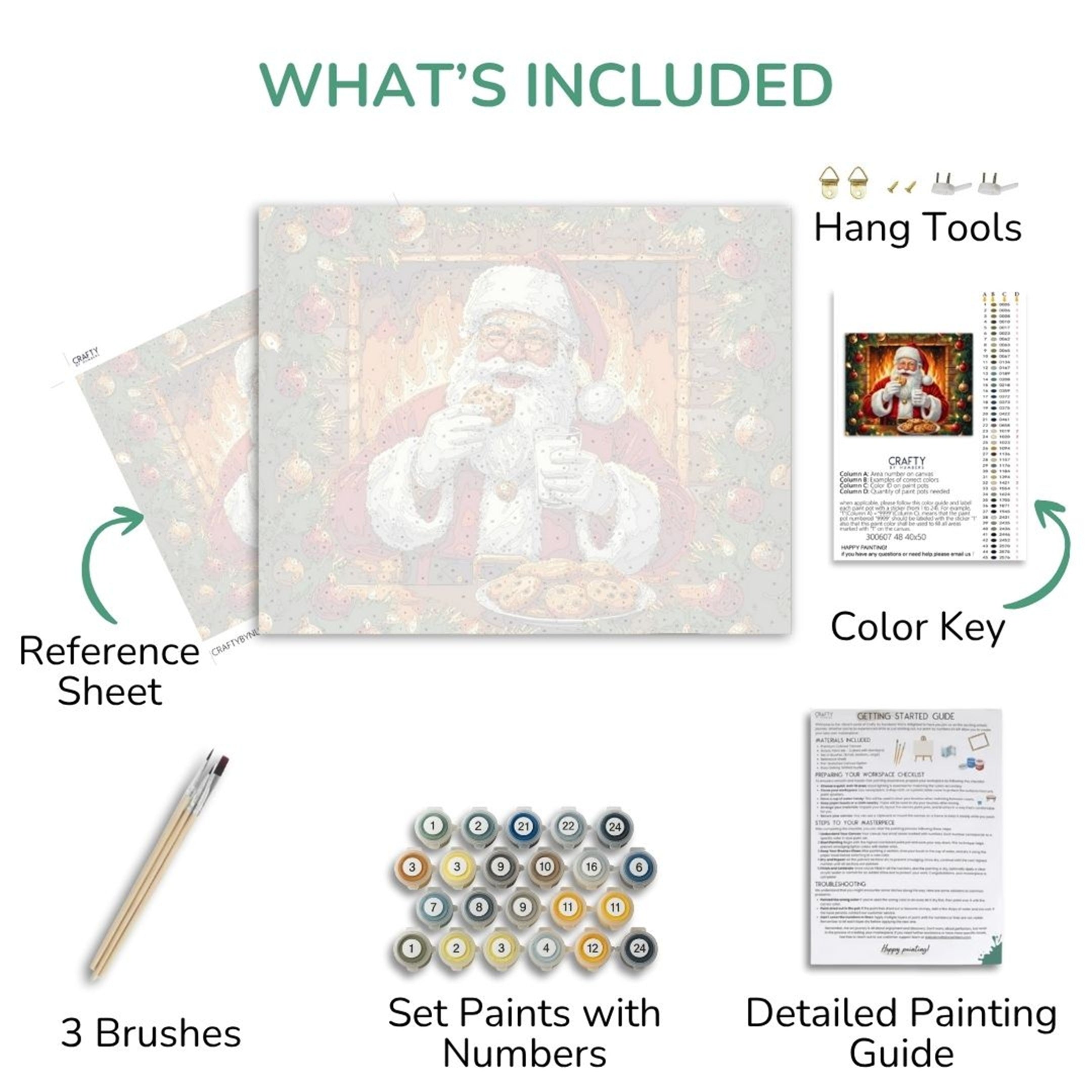 Celebrate the sweetest moment of Christmas with Santa’s Snack Break, a joyful paint by numbers kit featuring jolly old Saint Nick enjoying a plate of cookies and milk beside a roaring fireplace, framed by festive garlands and golden ornaments. Perfect for cozy crafting and warm winter vibes.