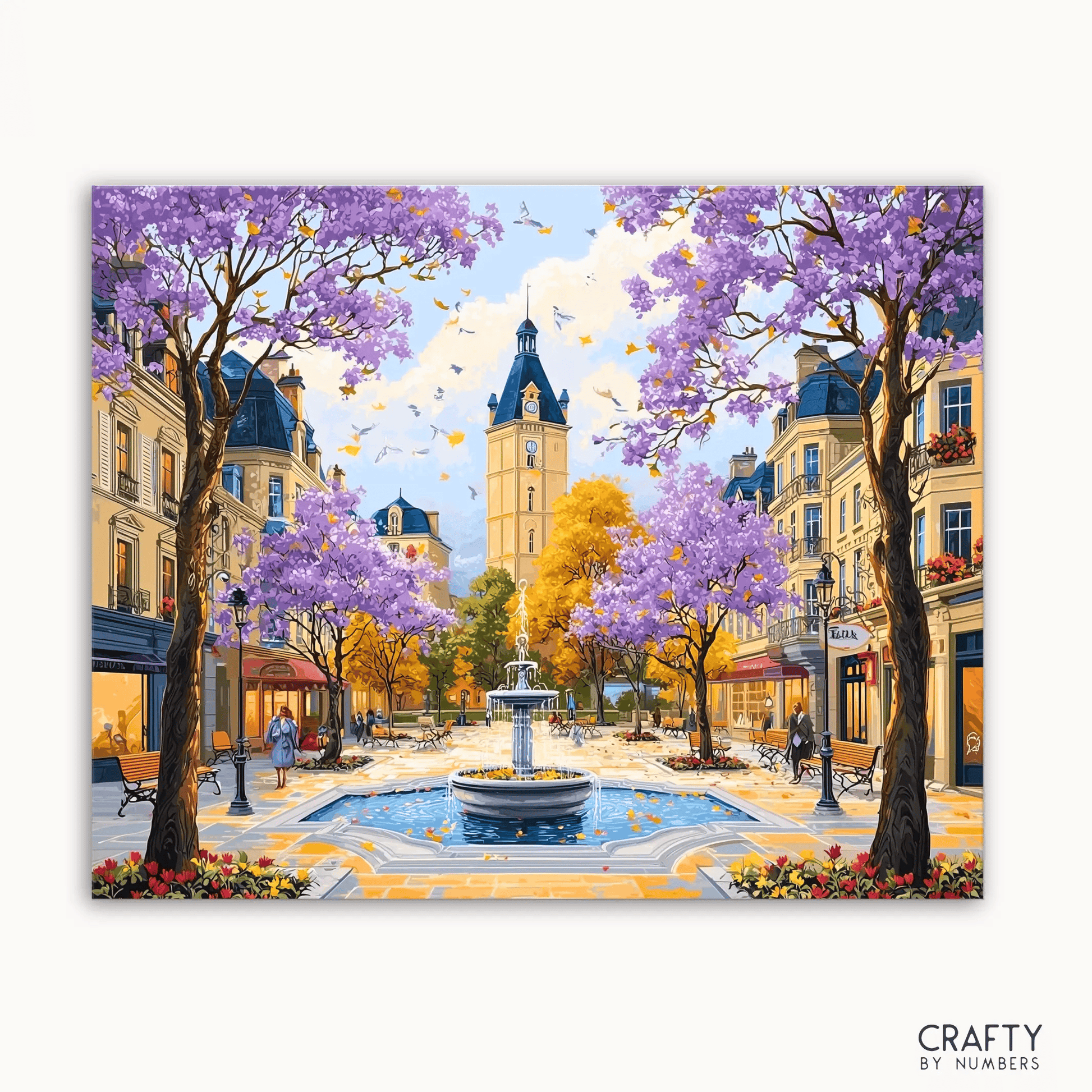Step into the serene beauty of Lavender Promenade, where blooming lavender trees line a golden boulevard and a graceful fountain anchors the scene. A perfect blend of romance and refinement, ready to be brought to life with your brush.