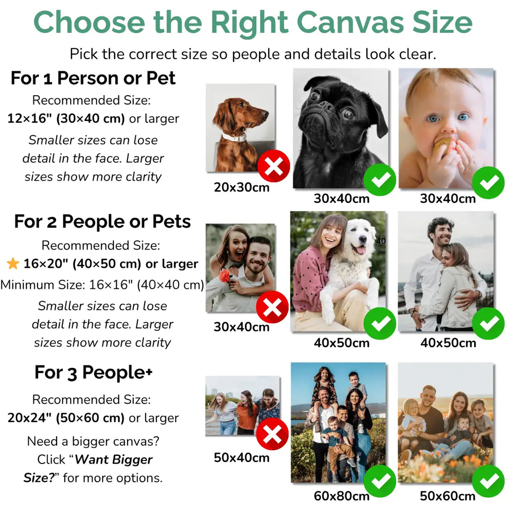 Larger canvases capture more detail. Pick the right size based on the number of people in your photo: