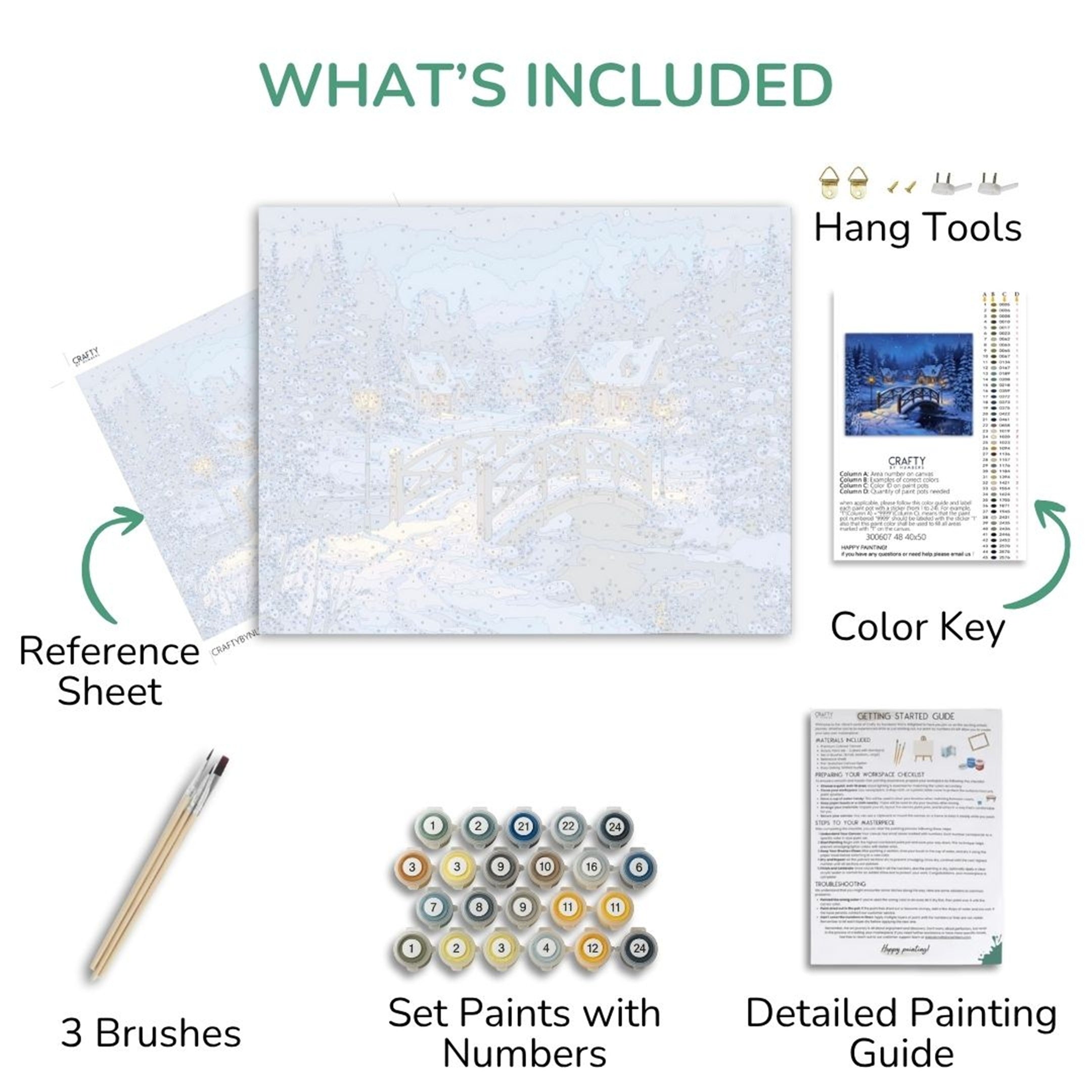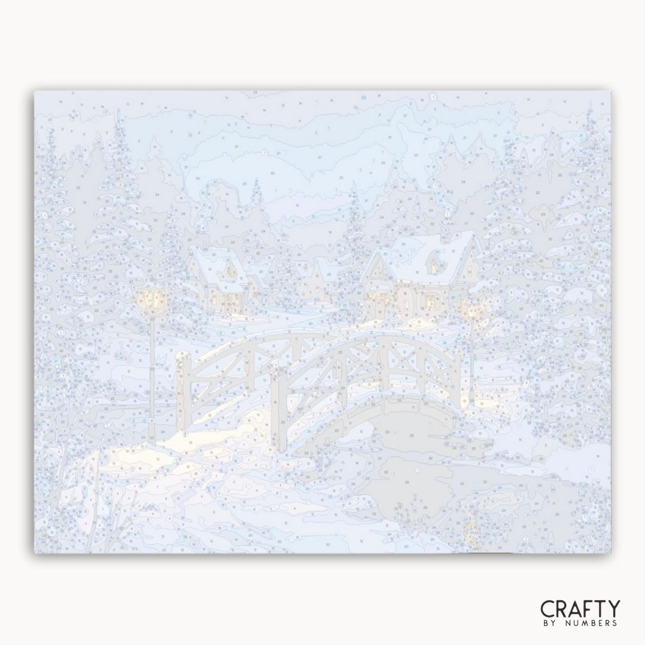 Step into a storybook scene with Bridge to Christmas Eve. This serene paint by numbers design features a gently arched bridge covered in fresh snow, glowing lamplight guiding the way toward a peaceful village. Cozy homes tucked among tall pines and drifting snow create a perfect wintery wonderland full of calm, tradition, and warmth.