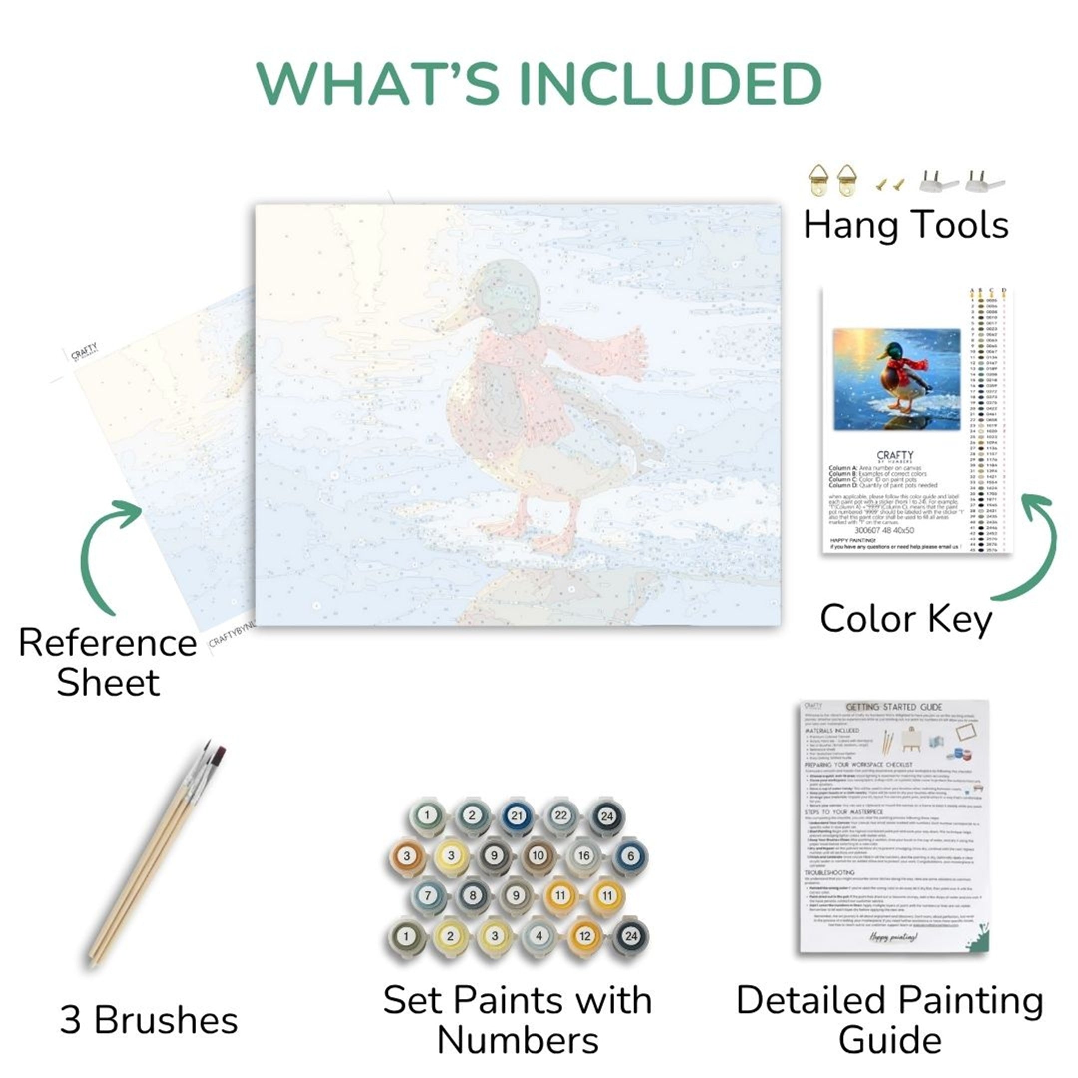 Duck the Halls is where winter whimsy meets waddling charm! This cheerful paint by numbers kit stars an adorable duck bundled in a red snowflake scarf, gliding confidently across a sparkling frozen lake. Surrounded by softly falling snow and the golden reflection of holiday light, this delightful design is a perfect pick for animal lovers, humor fans, or anyone who enjoys a joyful twist on traditional Christmas scenes.