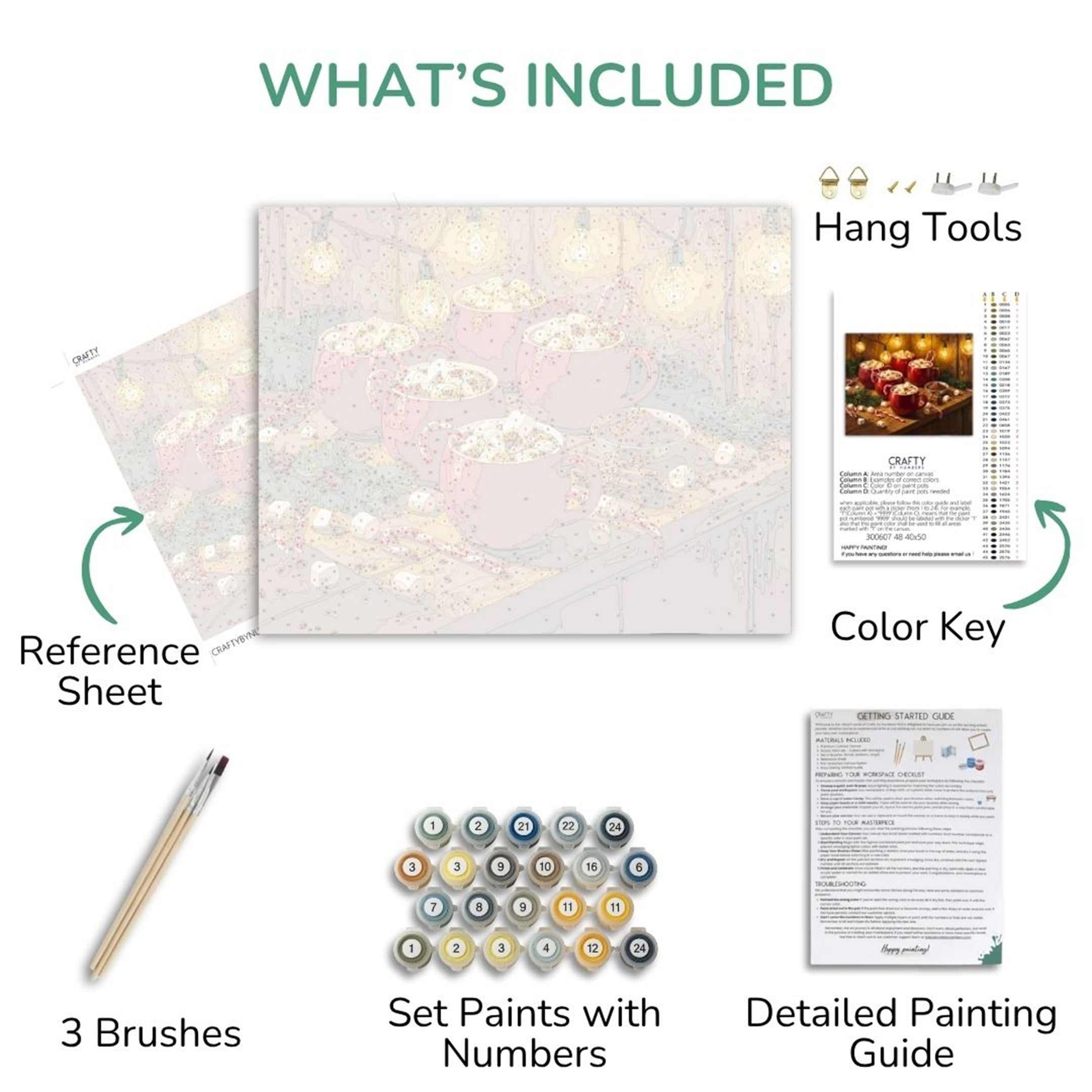 Overflowing with warmth and sweetness, Marshmallow Merriment captures the best parts of a holiday gathering. This festive paint by numbers kit features a rustic wooden table filled with rich red mugs of hot cocoa topped with toasted marshmallows, candy canes, cinnamon sticks, and glowing string lights. A perfect piece for anyone who loves holiday treats and cozy kitchen scenes.