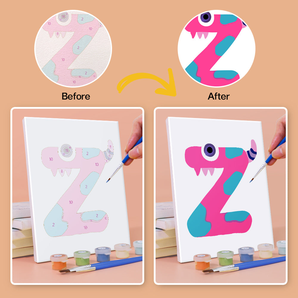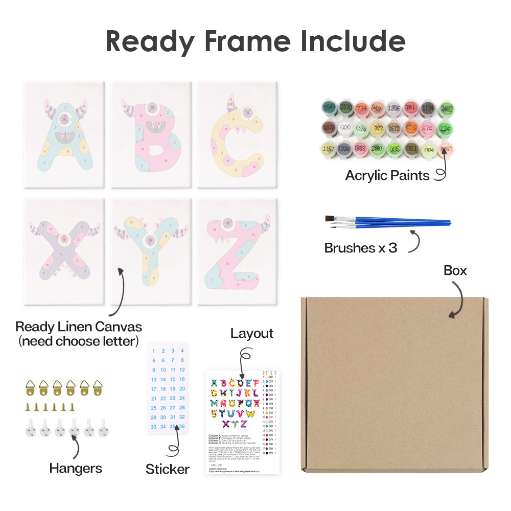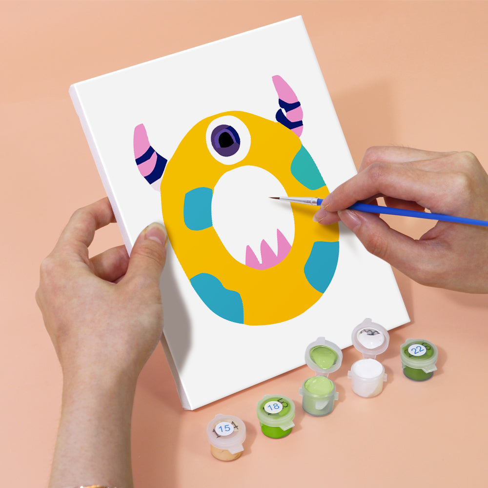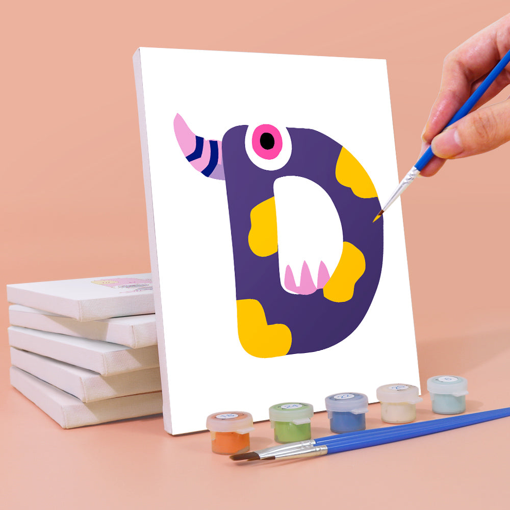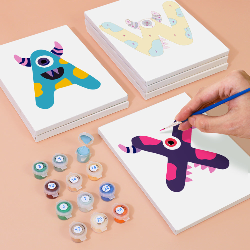 Meet the silliest ABCs around! Giggle Monsters (Alphabet) transforms every letter into a bold, playful creature with big eyes, goofy grins, and outrageous colors. Each letter canvas is part of an easy paint by numbers set—perfect for kids learning the alphabet or decorating their playroom. This kit includes premium linen canvases, pre-measured acrylic paints, and brushes to make painting smooth and mess-free. Whether you create names, words, or the full monster alphabet, it's a wildly fun way to bring art and learning together.