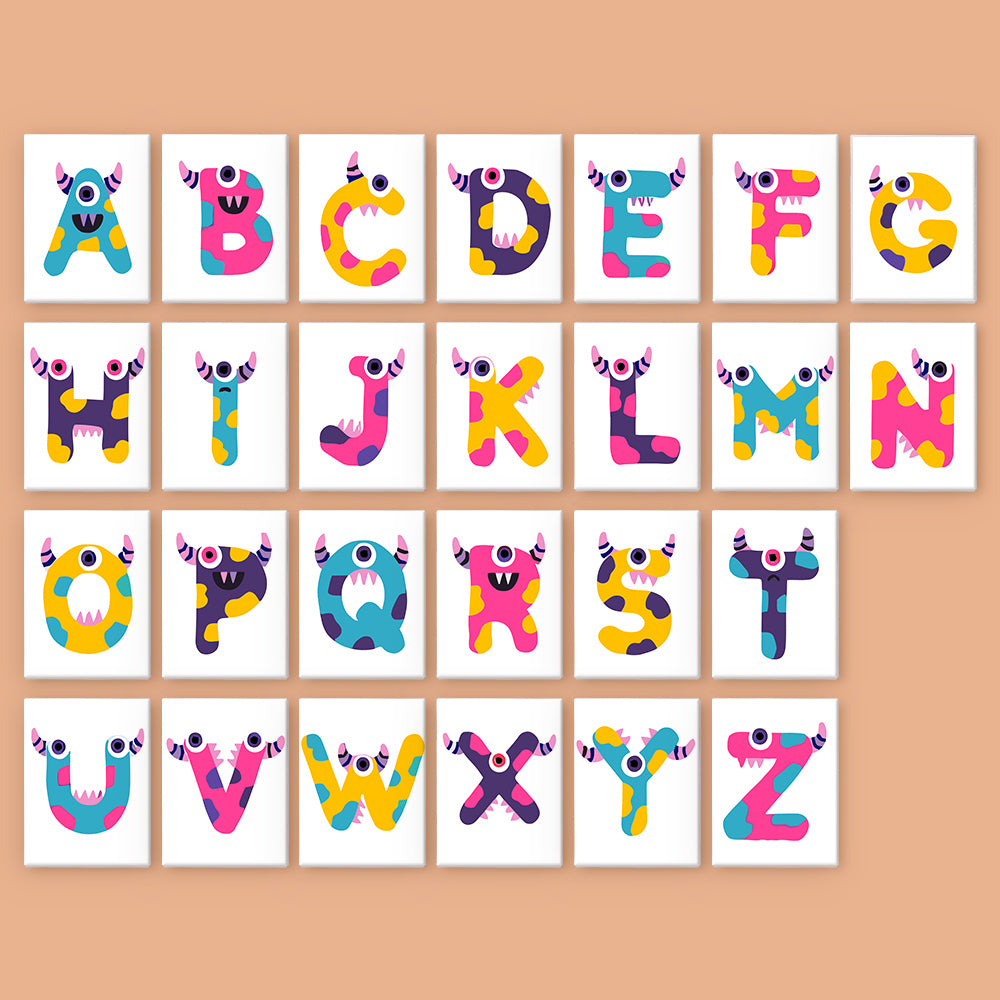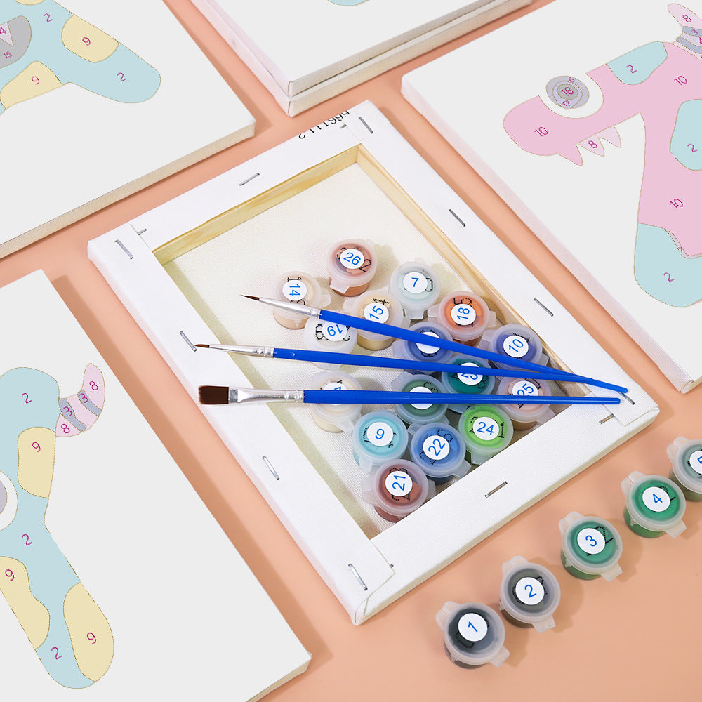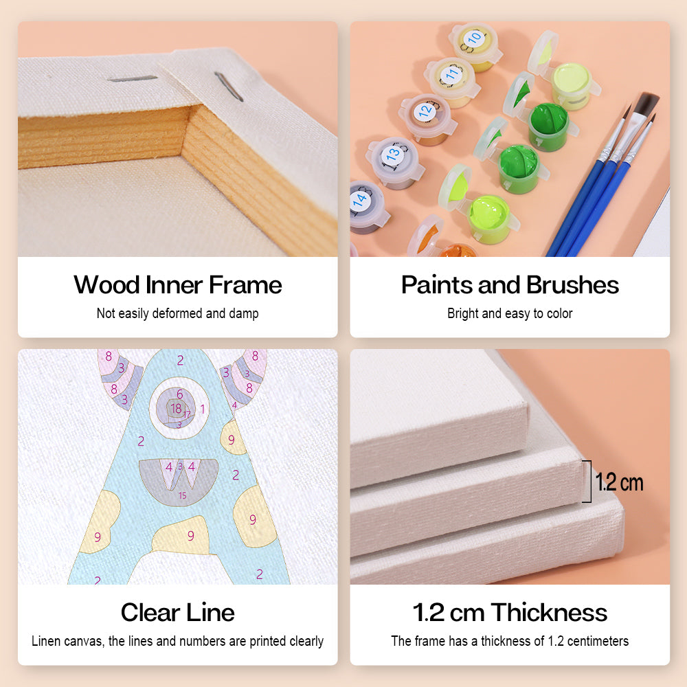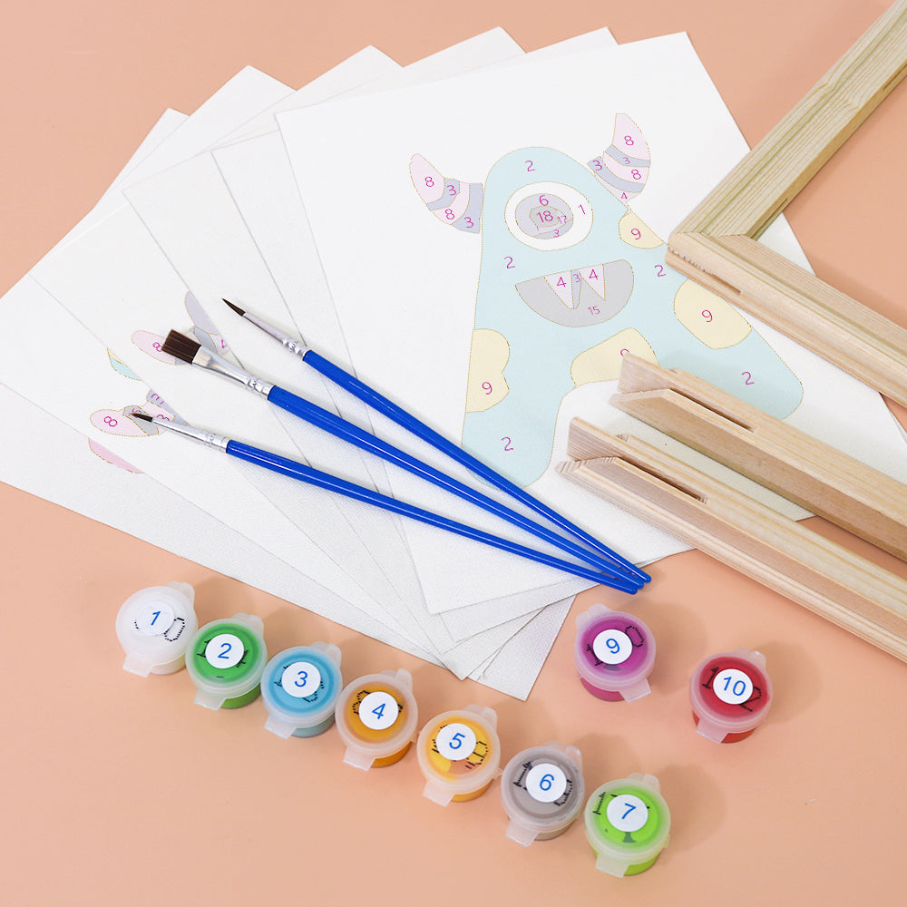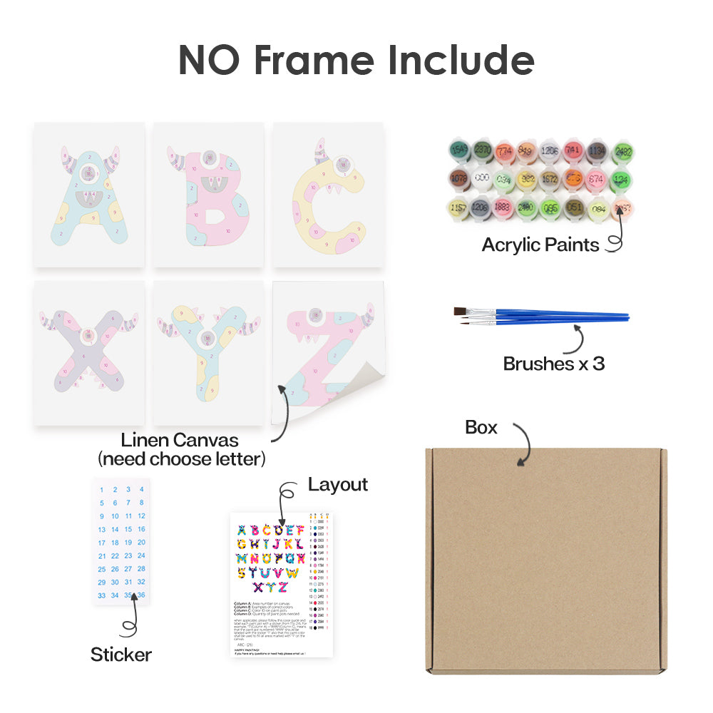 Meet the silliest ABCs around! Giggle Monsters (Alphabet) transforms every letter into a bold, playful creature with big eyes, goofy grins, and outrageous colors. Each letter canvas is part of an easy paint by numbers set—perfect for kids learning the alphabet or decorating their playroom. This kit includes premium linen canvases, pre-measured acrylic paints, and brushes to make painting smooth and mess-free. Whether you create names, words, or the full monster alphabet, it's a wildly fun way to bring art and learning together.