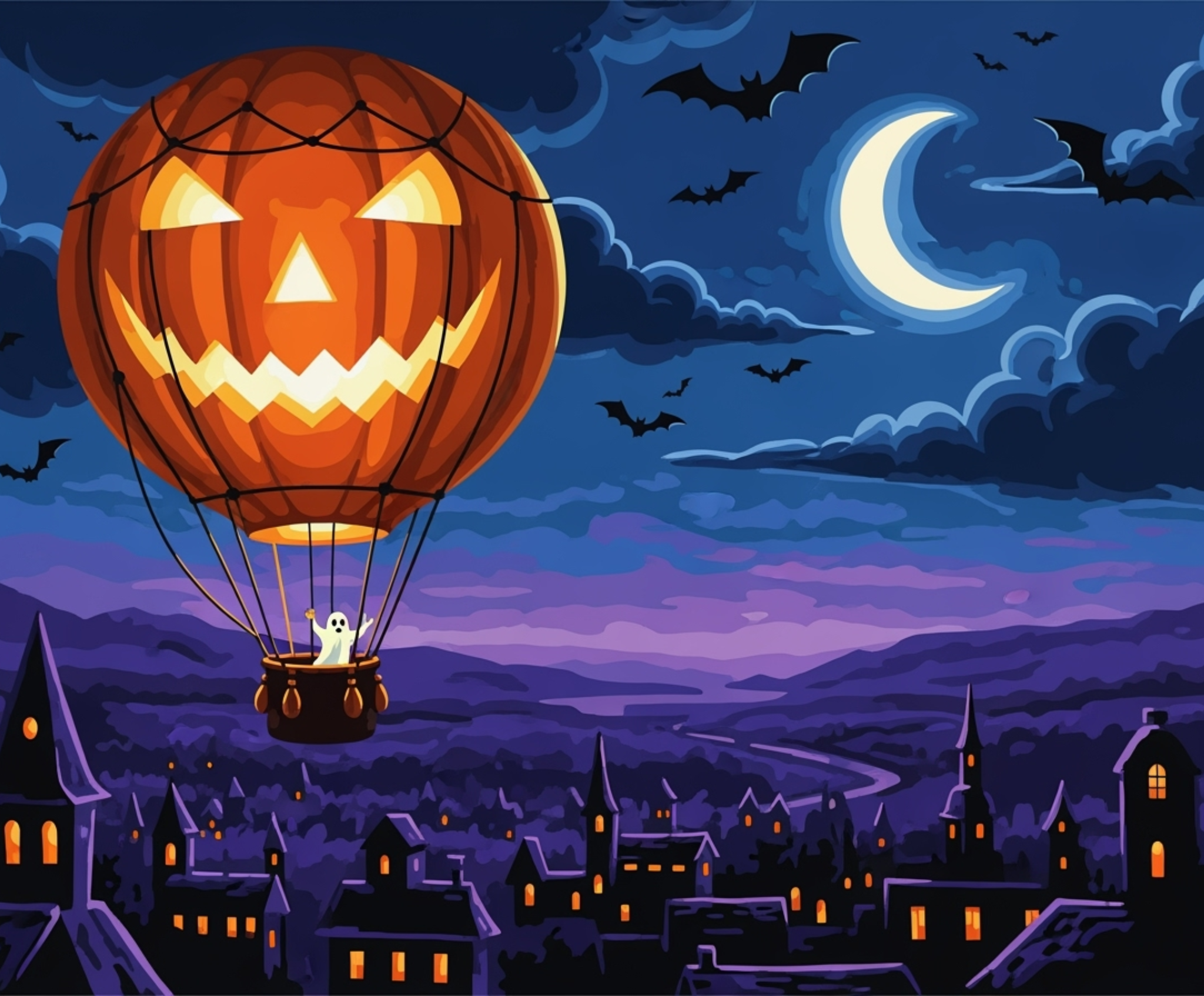 Haunted Heights takes Halloween to new levels—literally! This charming paint by numbers kit features a ghost piloting a jack-o’-lantern hot air balloon above a moonlit town, with bats swirling through the twilight sky. A festive and slightly spooky scene, perfect for all ages who love a bit of Halloween fun with their creativity.