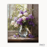 Embrace the gentle charm of Petals in the Sunlight, a graceful paint by numbers kit featuring a sunlit glass vase filled with lush purple and white blossoms. A peaceful and romantic design perfect for flower lovers and still life admirers.