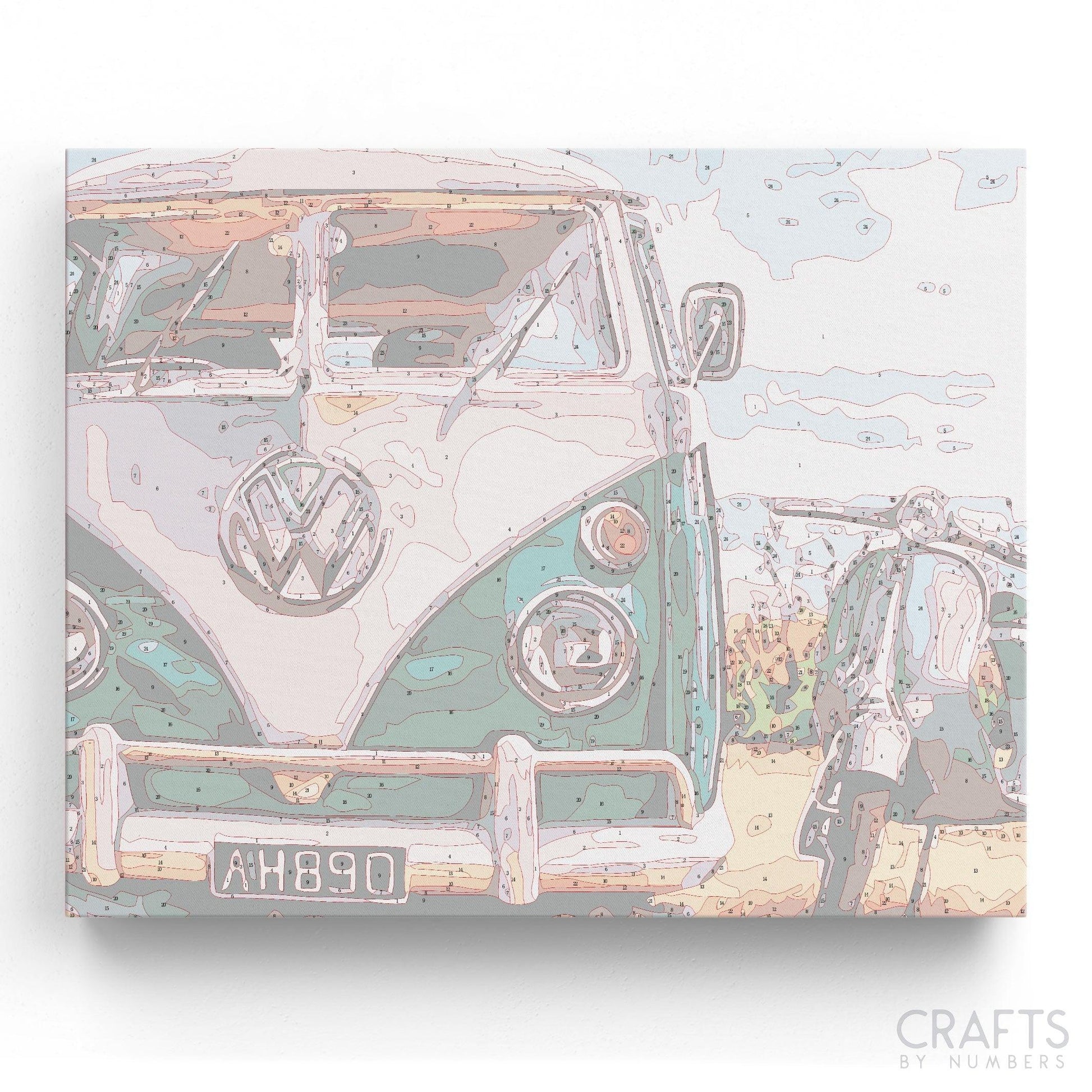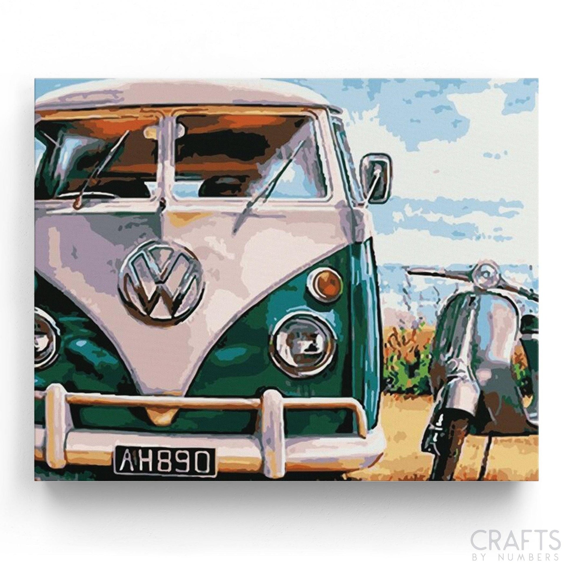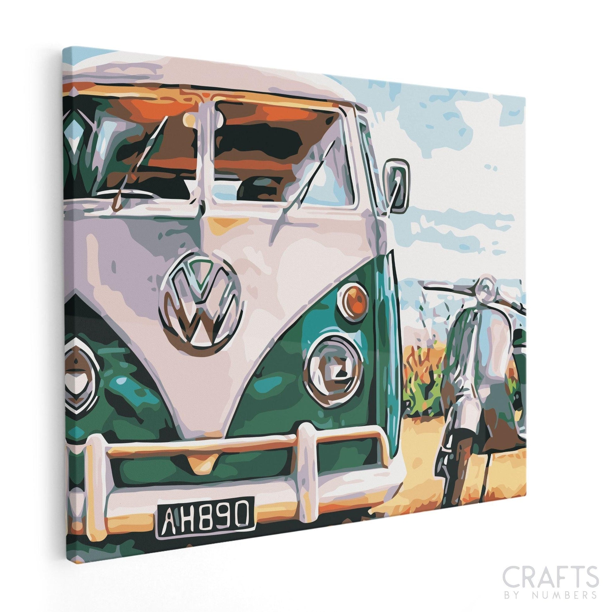 VW Van With Scooter Paint by numbers kit is easy, relaxing and perfect for beginners. Crafts by Numbers handpicked this design to ensure your painting experience is top-notch. Buy now this VW Van With Scooter design!