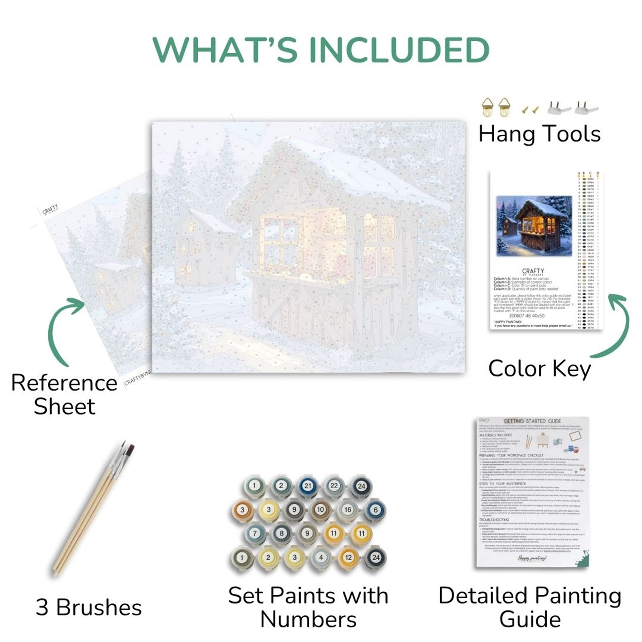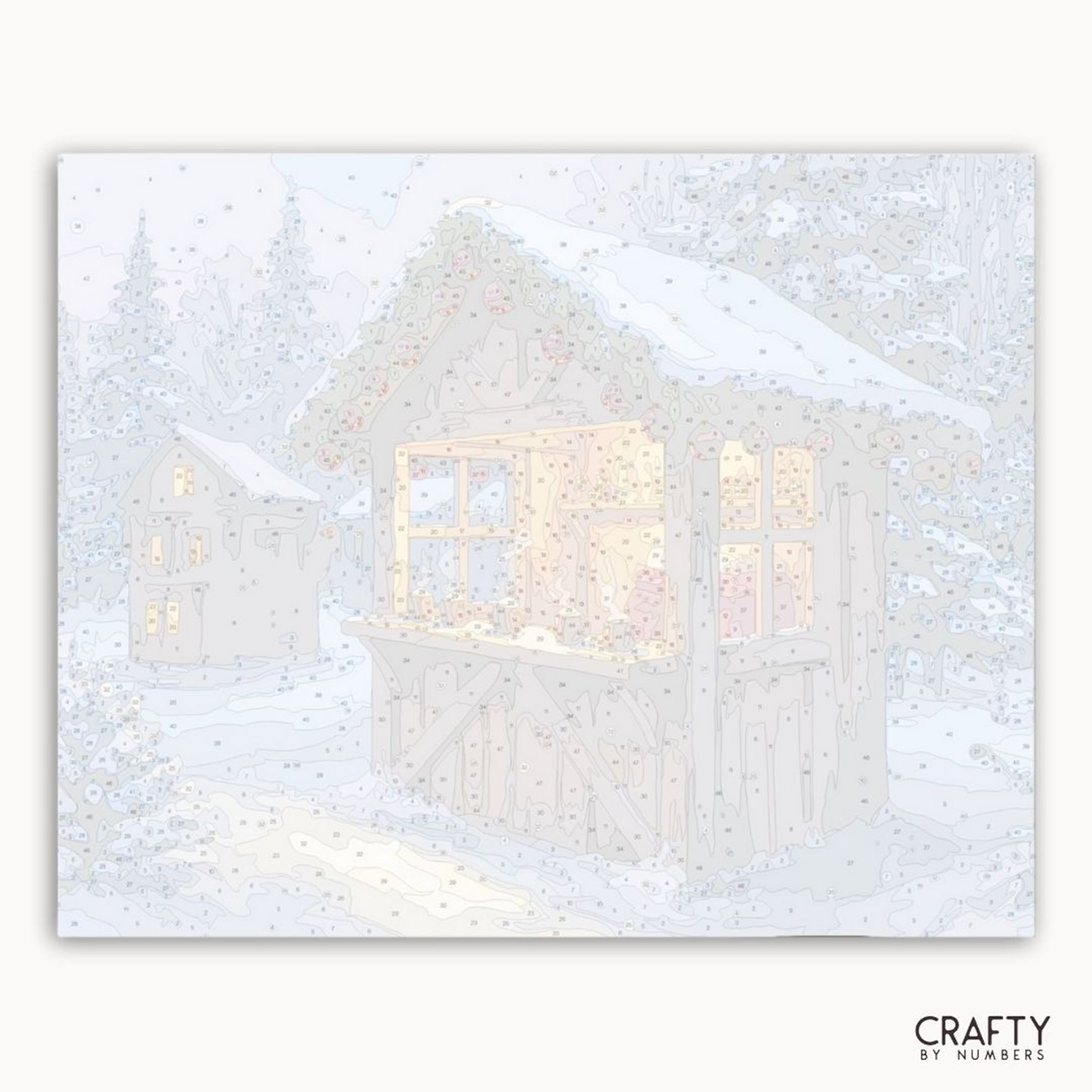 Warm Sips in Winter captures the magic of a quiet snow-covered forest and the comfort of something hot in your hands. This heartwarming paint by numbers design features a glowing holiday drink hut, strung with ornaments, surrounded by tall pines and gentle snowfall. With steam rising from cocoa mugs and a warm glow spilling into the snowy dusk, this piece is a hug in painting form.