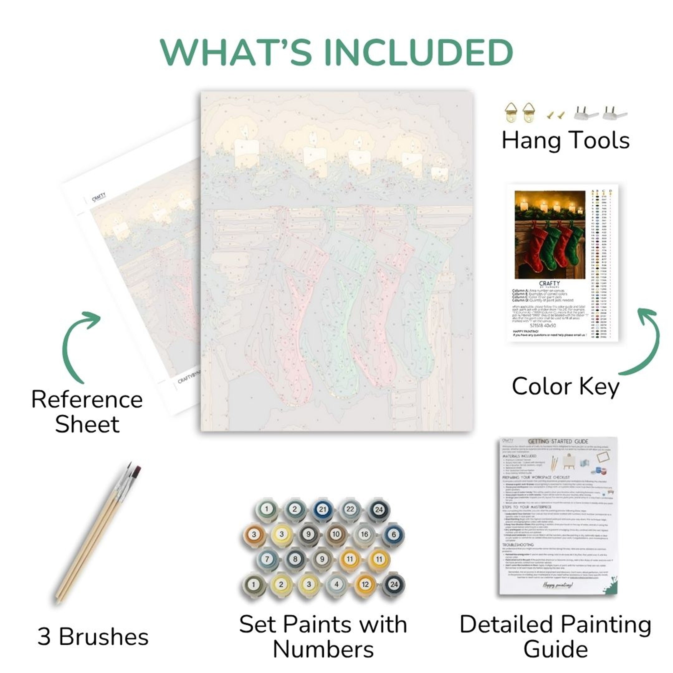 Four Stockings Hung brings a timeless Christmas ritual to life in glowing color. This classic paint by numbers kit captures a warmly lit fireplace mantle adorned with four cozy red and green stockings, flickering candles, and lush holiday greenery. A perfect tribute to family, tradition, and the magic of Christmas Eve, this scene is ideal for gifting or creating treasured seasonal décor.