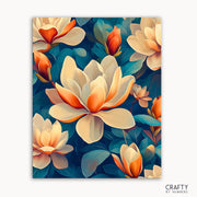 Magnolia Ember radiates warmth and elegance. This floral paint by numbers kit showcases creamy blossoms kissed with rich orange hues, set against lush, velvety greens — a striking balance of softness and fire.