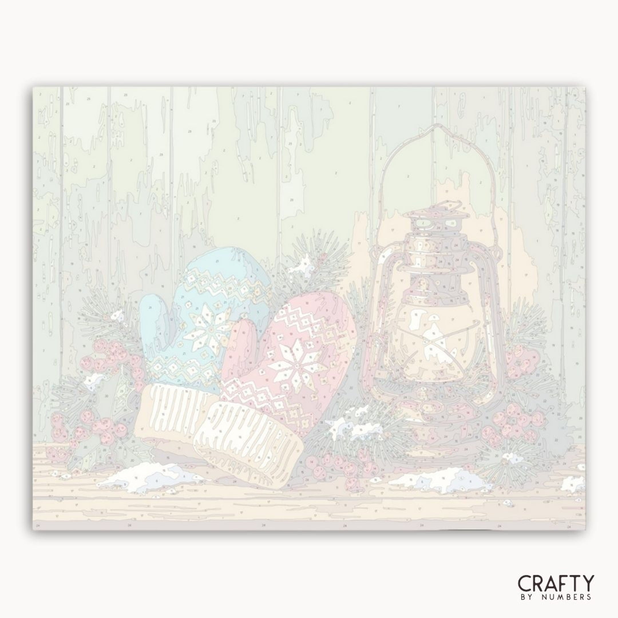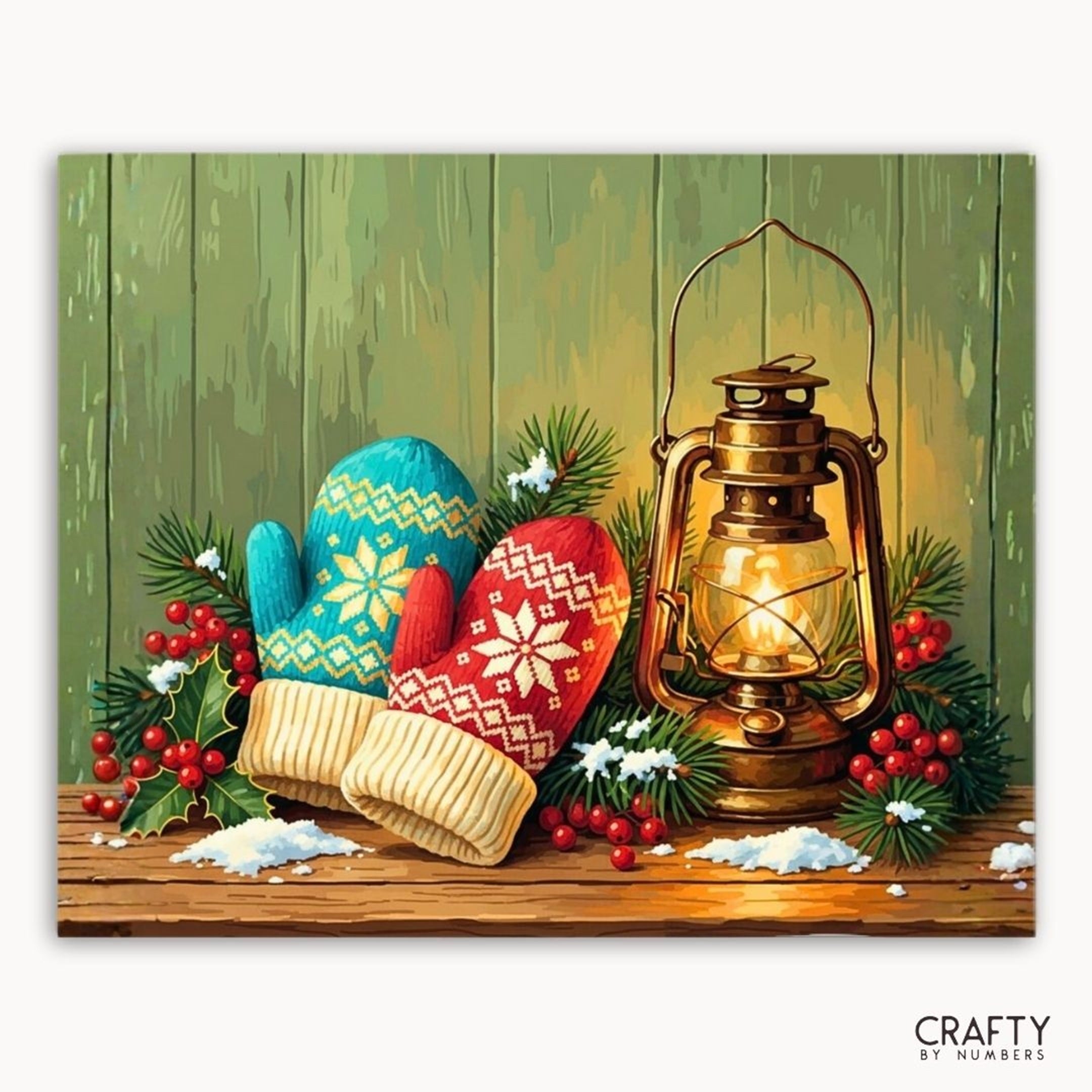 Let your creativity glow with Warmth in the Pines, a serene paint by numbers kit showcasing a vintage lantern casting soft light beside colorful knit mittens, pine branches, holly, and fresh snow. It’s the perfect blend of rustic charm and seasonal warmth for peaceful holiday decorating.