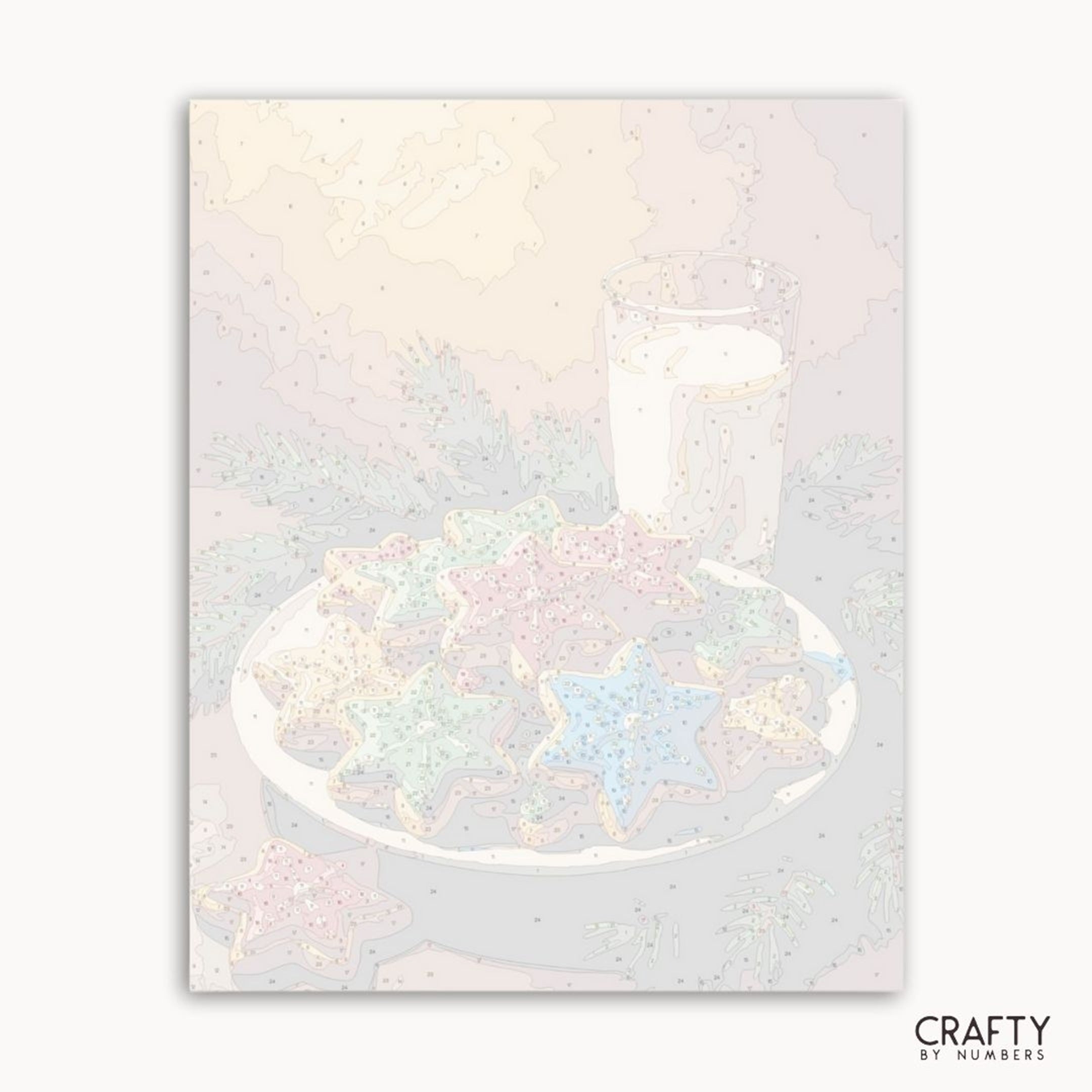 Set the scene for holiday magic with Cookies & Christmas Wishes. This vibrant paint by numbers kit captures a plate full of colorful, star-shaped cookies with a tall glass of milk, resting on a table framed in evergreen branches. A glowing golden background adds warmth to this nostalgic tradition—perfect for painters of all ages and lovers of holiday baking.