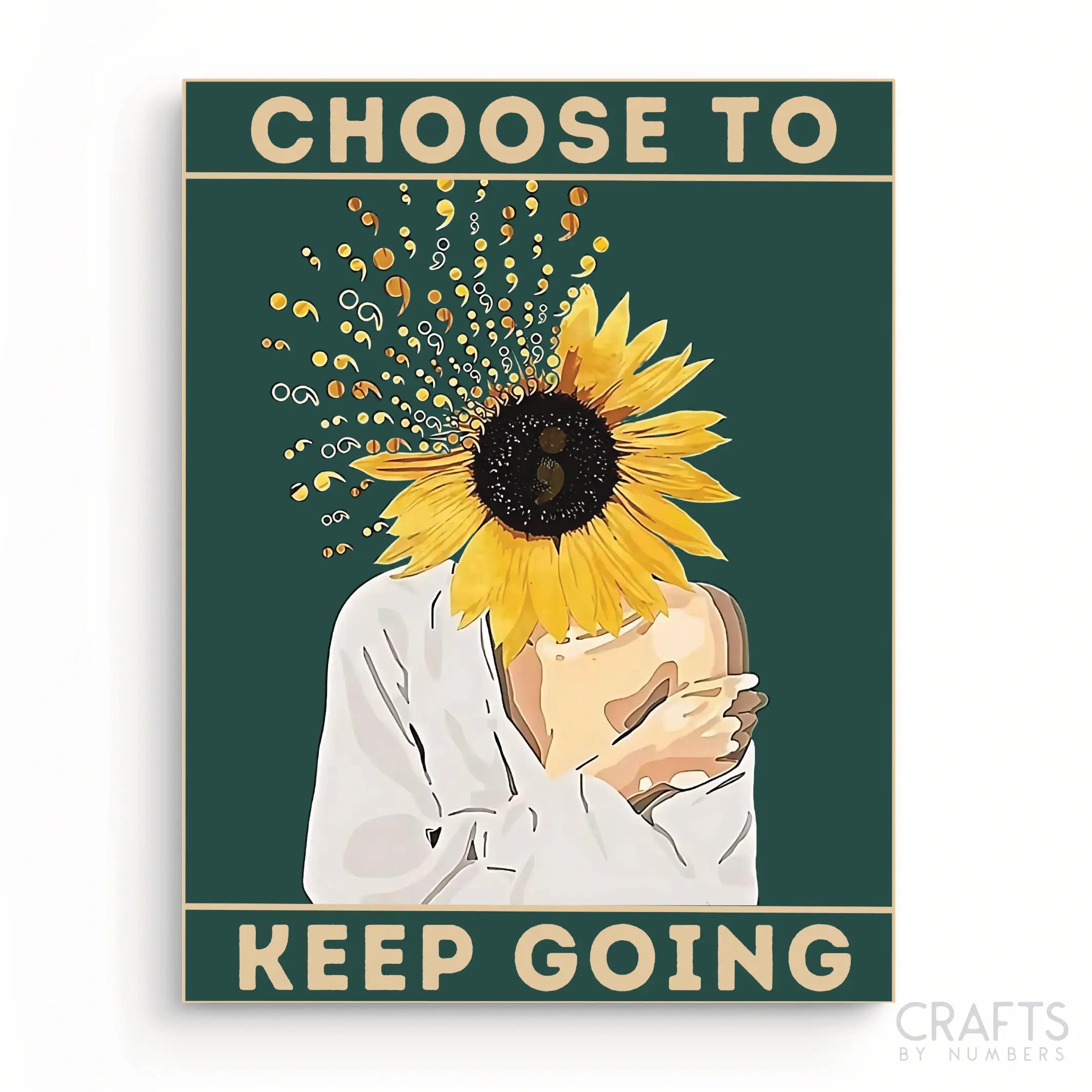 Find strength in every brushstroke with "Choose to Keep Going," a motivational paint-by-numbers kit that celebrates resilience and perseverance. This powerful design features a figure with a vibrant sunflower in place of a head, symbolizing growth and hope. The sunflower’s center holds a semicolon—a symbol of continuation and survival—surrounded by golden petals that radiate positivity.