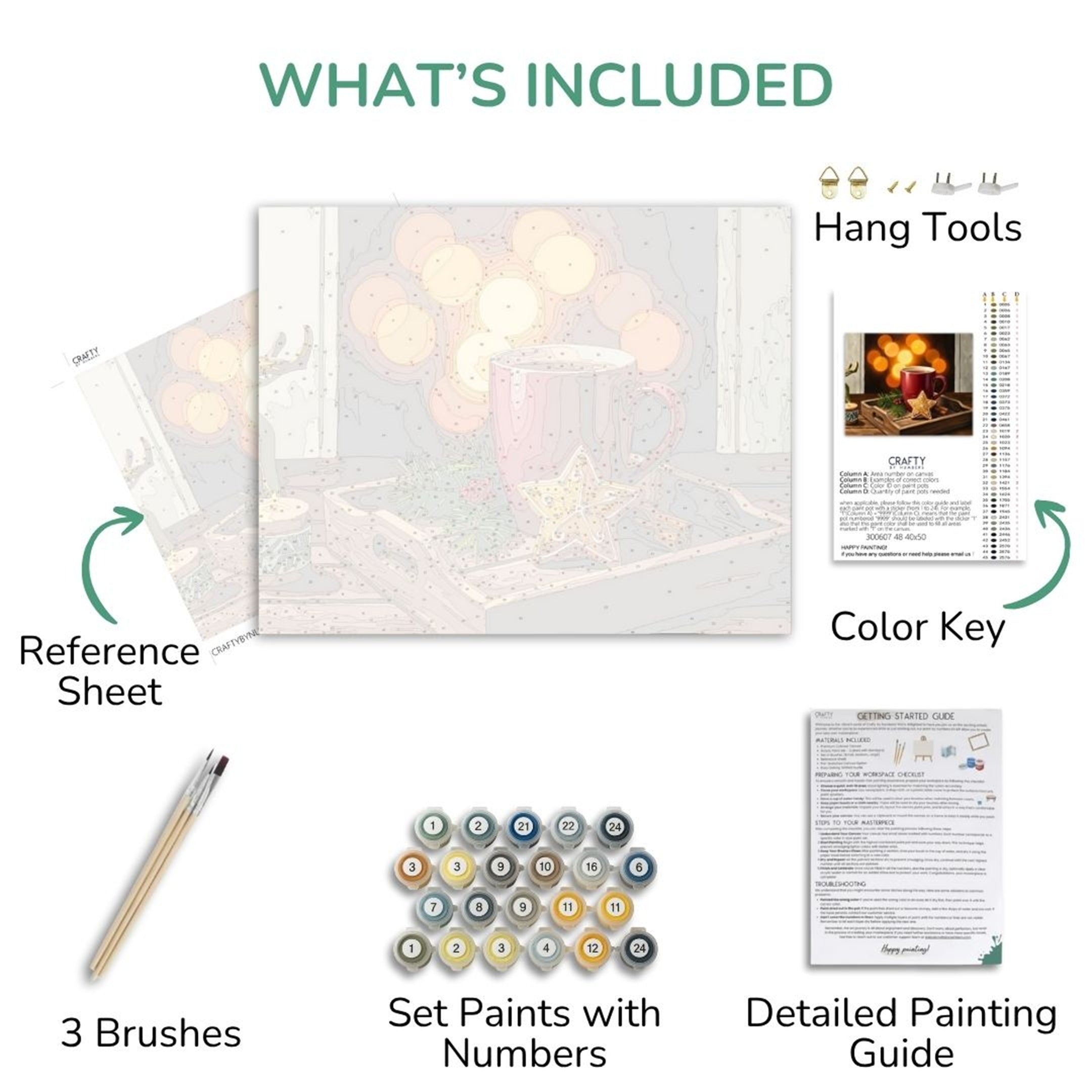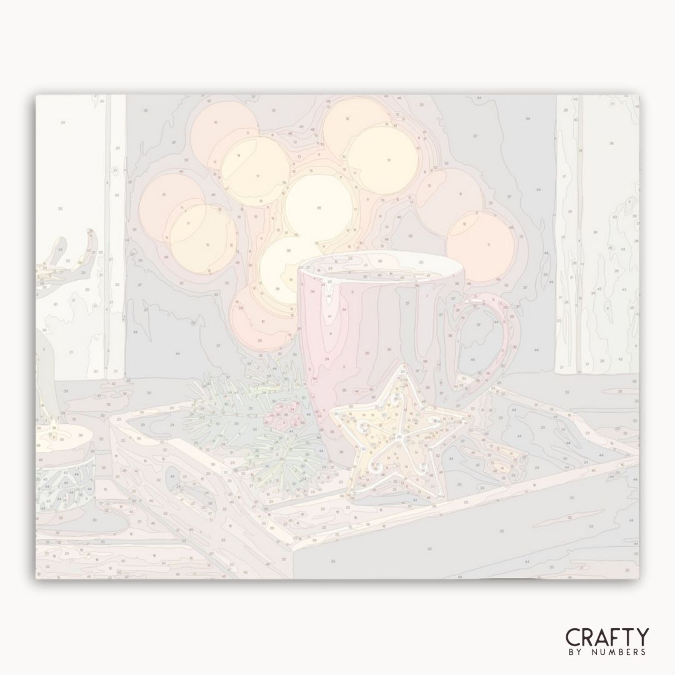 Merry Mug Moments captures that magical pause in the holiday hustle—a warm drink in hand, twinkling lights in the background, and the sweet taste of gingerbread on your plate. This heartwarming paint by numbers kit features a red mug, star-shaped cookie, cinnamon sticks, and pine sprigs resting on a rustic tray, glowing in the light of a cozy fire. A feel-good piece for anyone who loves Christmas warmth and a little moment of peace.